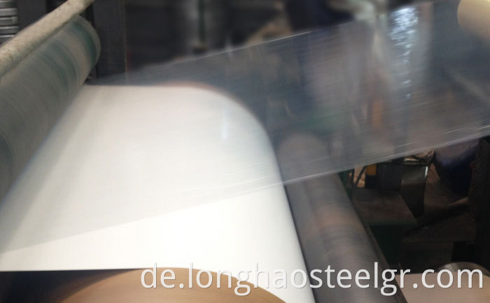 Der Schutzfilm ist ein transparenter oder farbiger Kunststofffilm, der auf der Oberfläche der vor gemalten verzierten Stahlspule überzogen ist. Ziel ist es, Kratzer an der bemalten Oberflächenfarbe während der kalten Rollenbildung zu verhindern. Unsere Kunststofffilmdicke beträgt 30 Mikrometer, 40 Mikrometer, 50 Mikrometer, 60 Mikrometer und 80 Mikrometer.